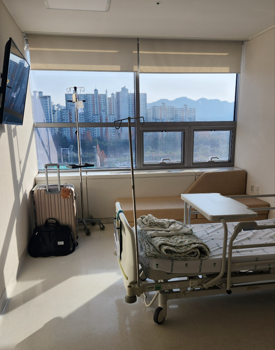 2박 3일이고 해서 과감히 1인실로 했어요. 햇살 가득한 깔끔한 방이에요. 생각보다 넓고 뻥뷰라서 좋았어요