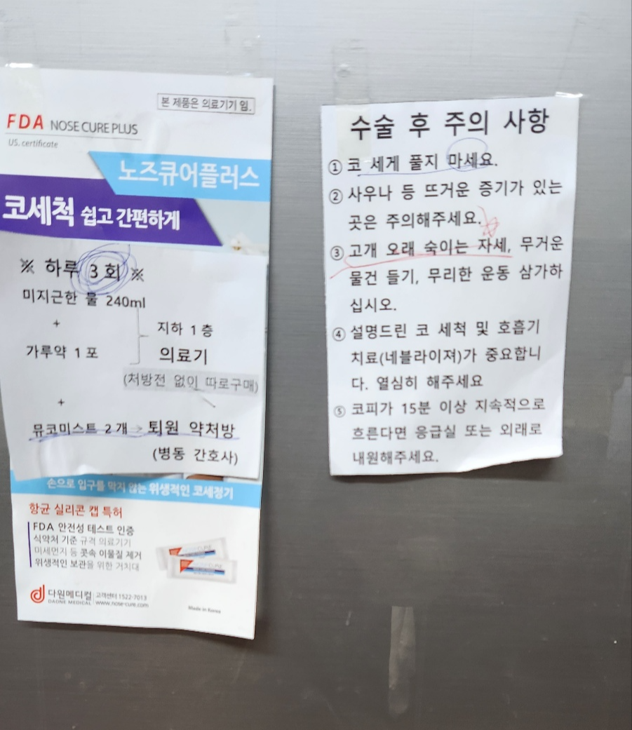 코를 세게 풀거나 심한 운동 사우나 하면 안 되고 일주일 후에 오라고 하더라고요